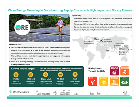 Off-Grid Renewable Energy II (ORE II) is a high-impact investment fund accelerating industrial decarbonization for global supply chains in south and south-east Asia. The fund's initial focus is on investing in Energy Service Companies (ESCOs) that provide rooftop solar solutions to commercial and industrial (C&I) clients in Bangladesh and Nepal, where solar adoption remains less than 5% of the potential.
